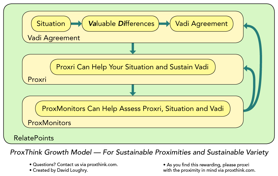 Do you and some other people have a shared situation you face together? Your shared situation can be whatever you are dealing with or considering. This graphic shows a process you can use, by starting at the top left and following the arrows (see 7-step overview below). The graphic leverages the ProxThink Growth Model, which makes the proximity more of a tangible thing. As a result, people can better relate to the proximity of their shared situation, which can help them deal with it. This can also help create more sustainable proximities and sustainable variety. You can click the graphic for an enlarged view.